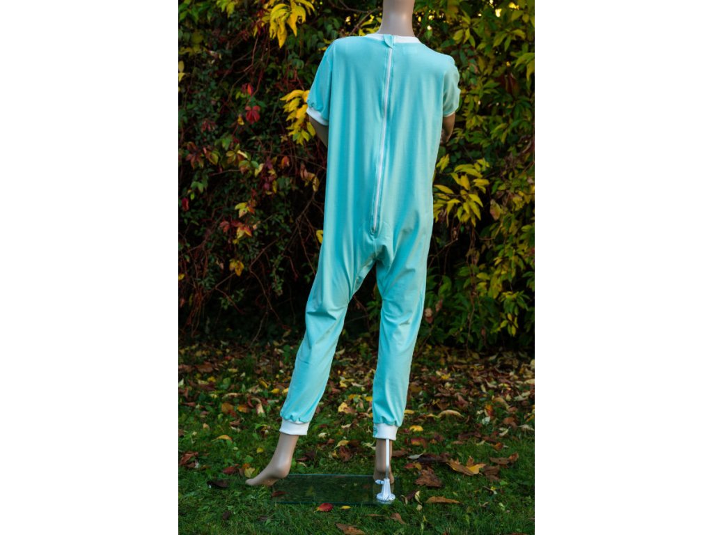 Tento nemocniční overal pro pacienty je vyroben z lehkého úpletu, který má gramáž materiálu 180 g, je to chladnější materiál vhodnější pro nošení v létě. Overaly vyrábíme ve velikostech S–XXXL. Na výběr je také z několika barev materiálu – Mintová, Světlá káva, Smetanová, Petrolejová. Samotnou barvu je možné ještě kombinovat se vzory – Motýli a květiny, Kostičky, Houby, Kytičky hnědé, Lidovka, případně zvolit variantu bez vzoru. Overal je vhodný pro náročné praní. Zip na zadním díle je všitý s tenkým podložením, které je u krku založeno tak, aby jezdec zipu netlačil. Spodní část zipu je zpevněna druhou vrstvou, aby se zabránilo co nejvíce trhání. Overal je vhodný pro pacienty ležící, proto na zádech není žádný šev. Naše overaly nejčastěji využívají pacienti v nemocnicích, domovech pro seniory a domovech s pečovatelskou službou. Jsou vhodné jak pro ležící, tak neležící pacienty.
