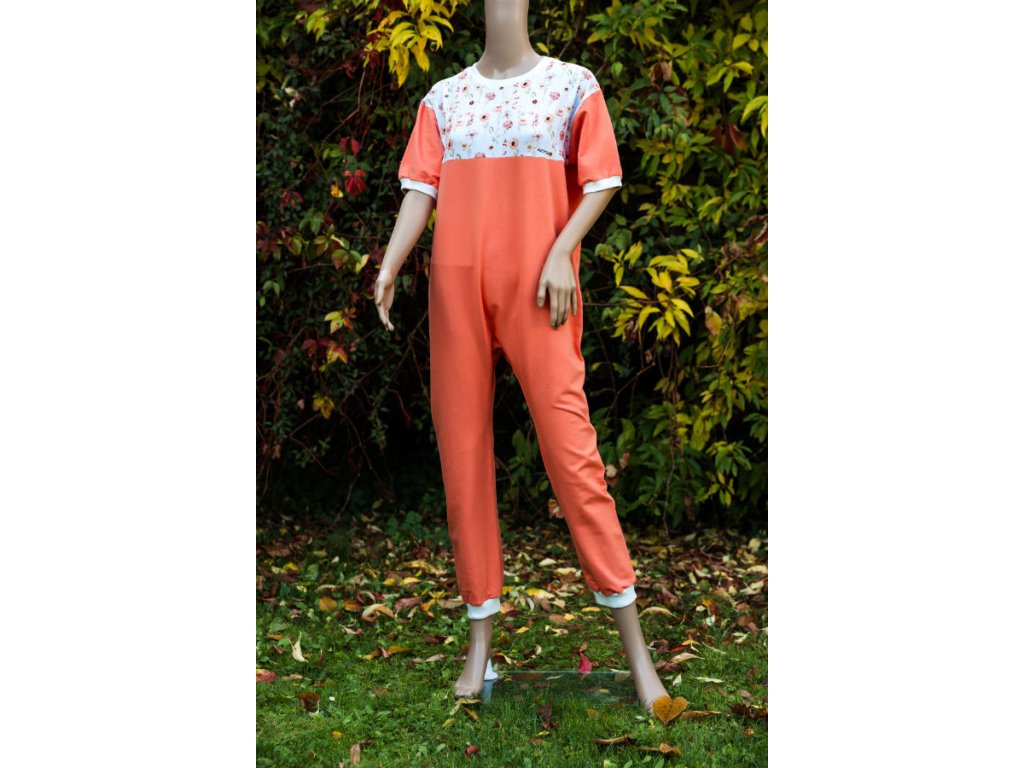 Tento nemocniční overal pro pacienty je vyroben z lehkého úpletu, který má gramáž materiálu 180 g, je to chladnější materiál vhodnější pro nošení v létě. Overaly vyrábíme ve velikostech S–XXXL. Na výběr je také z několika barev materiálu – Mintová, Světlá káva, Smetanová, Petrolejová. Samotnou barvu je možné ještě kombinovat se vzory – Motýli a květiny, Kostičky, Houby, Kytičky hnědé, Lidovka, případně zvolit variantu bez vzoru. Overal je vhodný pro náročné praní. Zip na zadním díle je všitý s tenkým podložením, které je u krku založeno tak, aby jezdec zipu netlačil. Spodní část zipu je zpevněna druhou vrstvou, aby se zabránilo co nejvíce trhání. Naše overaly nejčastěji využívají pacienti v nemocnicích, domovech pro seniory a domovech s pečovatelskou službou. Jsou vhodné jak pro ležící, tak neležící pacienty.