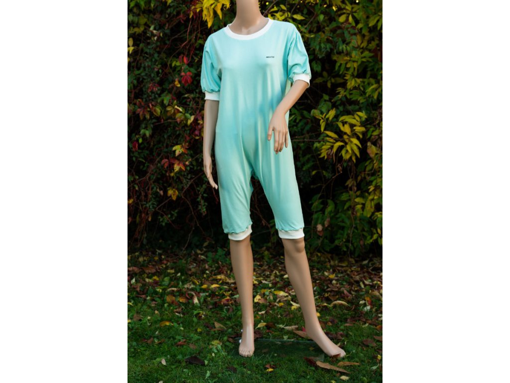 Tento nemocniční overal pro pacienty je vyroben z lehkého úpletu, který má gramáž materiálu 180 g, je to chladnější materiál vhodnější pro nošení v létě. Overaly vyrábíme ve velikostech S–XXXL. Na výběr je také z několika barev materiálu – Mintová, Světlá káva, Smetanová, Petrolejová. Samotnou barvu je možné ještě kombinovat se vzory – Motýli a květiny, Kostičky, Houby, Kytičky hnědé, Lidovka, případně zvolit variantu bez vzoru. Overal je vhodný pro náročné praní. Zip na zadním díle je všitý s tenkým podložením, které je u krku založeno tak, aby jezdec zipu netlačil. Spodní část zipu je zpevněna druhou vrstvou, aby se zabránilo co nejvíce trhání. Naše overaly nejčastěji využívají pacienti v nemocnicích, domovech pro seniory a domovech s pečovatelskou službou. Jsou vhodné jak pro ležící, tak neležící pacienty.